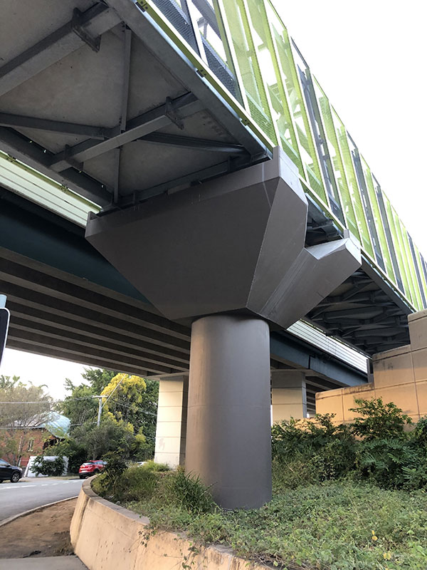 Abutment A involved the addition of an extension to the existing abutment. Pier 1 consisted of 1800 dia RC pile, with 1800dia RC column and a precast headstock which was lifted in during a single lane closure of the Pac Mwy off ramp. Pier 2 consisted of 3 x 1200 dia RC piles, a 1650 deep pile cap below the ground, which interfaced with an existing Energex service and was below the existing concrete barrier, an 1800dia RC column and a cast insitu RC headstock. Abutment B consisted of 1200 dia RC pile and cast insitu abutment headstock.