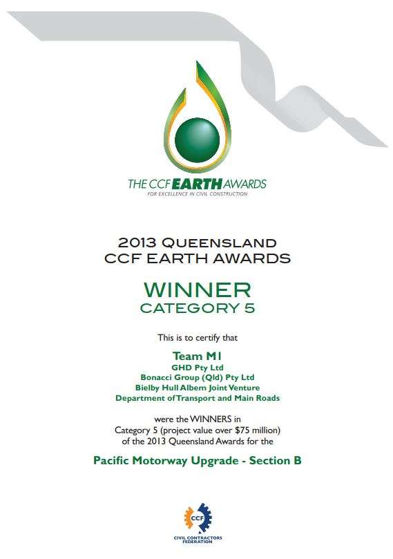 This project was awarded the 2013 Queensland CCF Earth Awards Category 5 (projects > $75M) for excellence in civil construction.